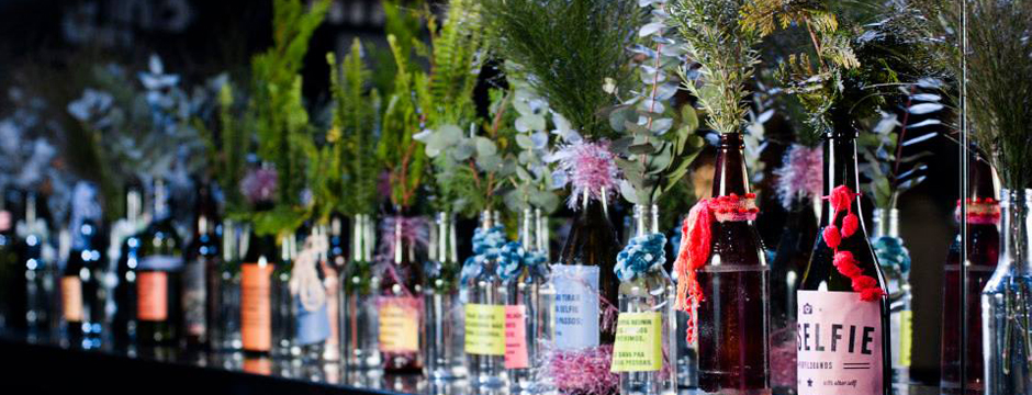 - garrafas reaproveitadas com mensagens e folhagens para a decoração.